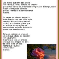 foi feita a leitura de poesias do livro “Obras de Irene Lisboa – um dia e outro dia… outono havias de vir”, começando-se pela seguinte frase da escritora “Ao que vos parece verso chamai verso e ao resto chamai prosa”. E, porque estamos na estação outonal, continuou-se com a leitura de poemas, de outros autores, relacionados com esta época do ano.
